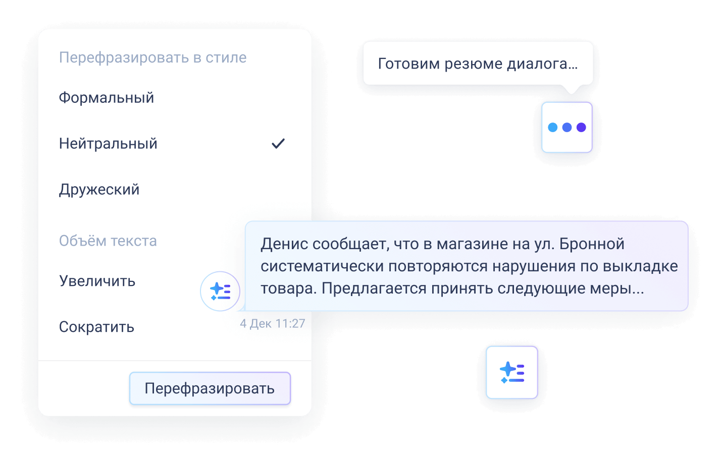 AI проанализирует ваш диалог, составит его краткую сводку, предложит варианты автоответов и перефразирует сообщения